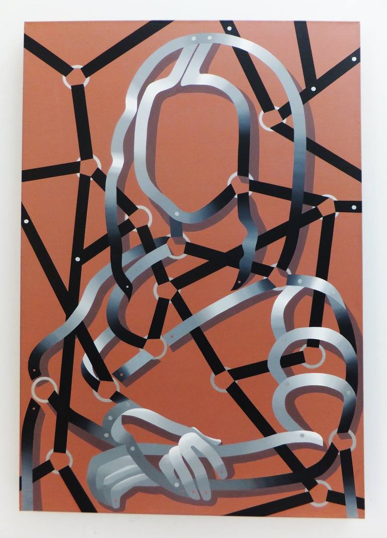 I compose paintings with the illustrated placement of straps, release being the objective. Imagery is achieved through released straps, which are highlighted in grey tones to further seperate from the basic black straps. Painted connecting rings and rivets are involved to help further manipulate for...