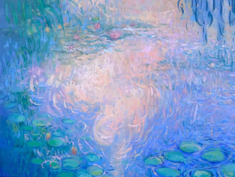 I copied lilies that were originally painted by Monet. His large canvases are very long, and I had to combine five different fragments from his paintings to make it look like one solid piece. Monet painted his lilies as a response to World War One.
