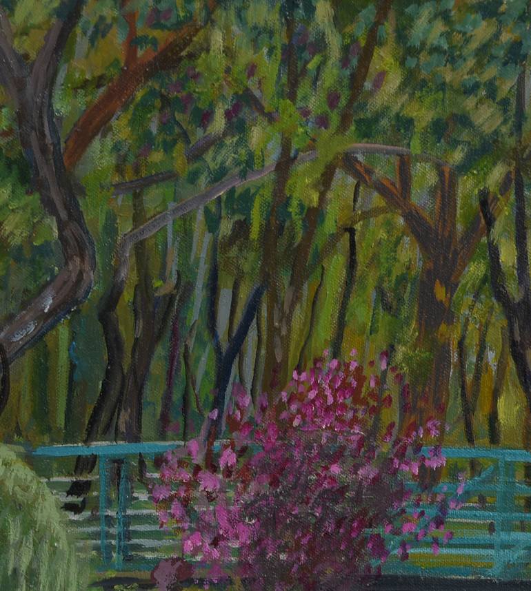 This is painted for the Overland Park Arboretum to raise money in support of the Arboretum. It is a replica of Monet's garden showing the bridge over a lily pond that can't be seen from this angle. It is early in the growing season as not all the flowers have bloomed. It was painted on site and i to...