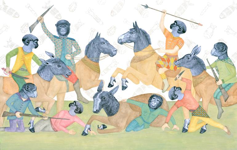 In “Monkey Madness”, anthropomorphized apes are depicted in a battle scene. Not unintentionally, the image is reminiscent of Pierre Boulle’s 1963 novel “Planet of the Apes” - now made famous through a series of films. In “Planet of the Apes”, the tables are turned, so that the apes are the perpetra...