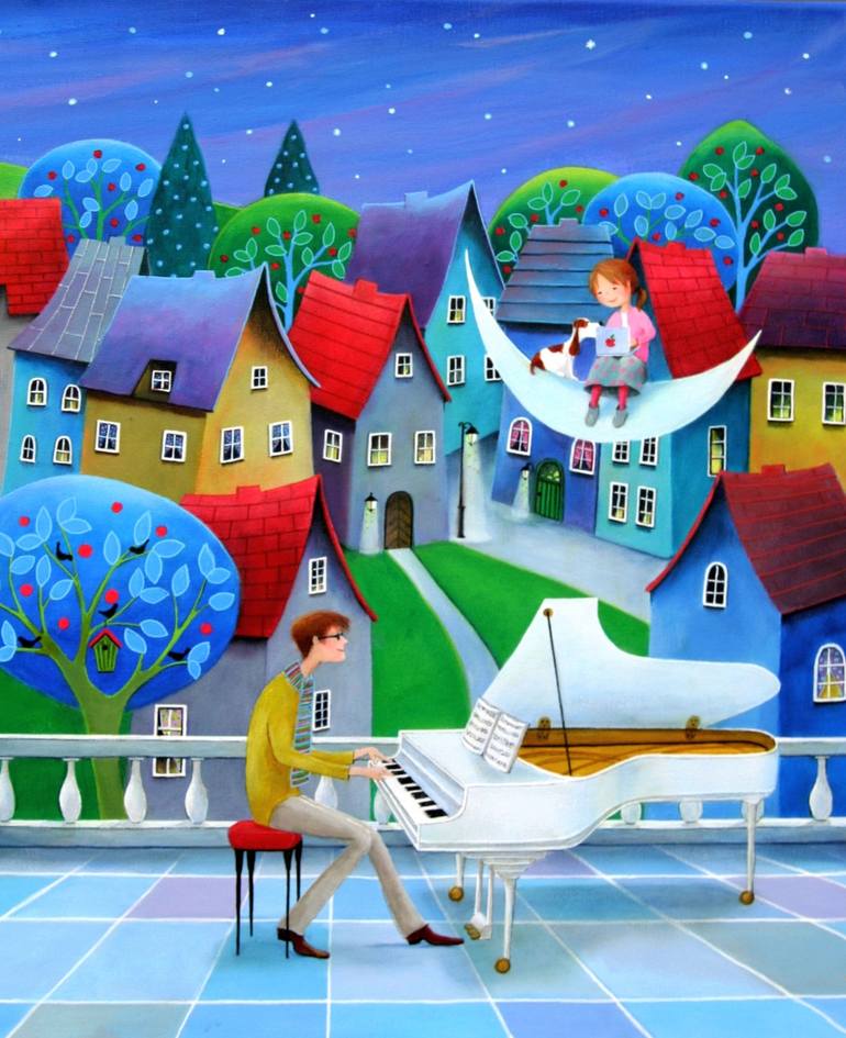 I was growing up and studied fine arts in Poland, but have been living in Denmark since 2006. My art reflects a Naive Art style, and I create my stories with a childlike innocence through subject, shape, and colour. Although my artworks often tell simple, easily understood, and idealized scenes of everyday life with a touch of melancholy and humour, they are fabulously colourful. In 2015, I illustrated the book "Journey to the Land of Fairy Tales." The same year I won the Grand Prix at The Art Naif Festival in Katowice, Poland.