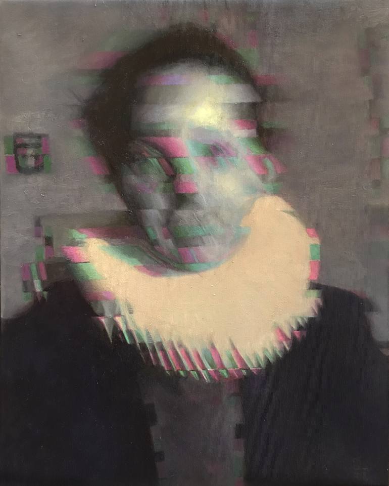 Chilean artist Diego Palacios (1983) began working as a painter in 2014. As an autodidact Palacios has acquired painting independently. For four years he has been intensively and continuously dealing with the theory and practice of painting. He is fascinated by the artistic skills of the old masters and studies their approach meticulously. Palacios got an insight into the art world of Chile, where he made his first experiences with painting and worked in the studio of an artist friend. When he moved to France in 2008 - first to Paris, then to the countryside in the south of France - he came into contact with the art scene there and got to know new approaches in the field of painting. At that time, Palacios was still working in another profession - the wine trade. However, his interest in the arts already existed and grew more and more over the years until Palacios finally decided to turn his passion into a career. Although the artist never went to an art academy, he went through his own personal school by working in various places around the world and taking every opportunity to learn from the artistic demands and events there. He participated in artist residencies in Sweden and Scotland before he decided in early 2018 to move to Leipzig and be part of the LIA program. Diego Palacio's painting reveals various levels that shift between consciousness and the subconscious. This impression is supported by the play of light, shadow, and transparency. Palacio's works indicate an old master approach, but is broken by contemporary subjects and elements. Portraiture forms the emphasis in the oeuvre of the Chilean painter. The depicted persons were first staged by Palacios and then photographed. The artist then consciously processes these photographs digitally in order to create the break between the depicted, ancient-looking situation and the contemporary reference. The faces appear in a light reminiscent of Rembrandt or Van Dyck, and the clothes and gestures of the portrayed people also imply bygone times. However, these familiar features and the image that appears in the mind's eye are broken by the glimmering color effects, distortions and reflections of the faces. Palacio's images challenge the recipients, put their viewing habits to the test and stimulate questioning.