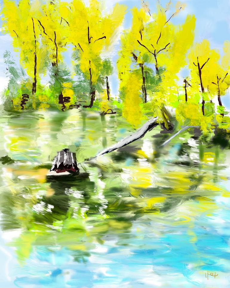 A lake in Montana, the reflection, light, color, atmosphere all inspired this work. I painted in oil and acrylic for years; I am now working digitally. Even though I create on an iPad, I am still painting, blending and mixing colors, applying strokes; it's all there.