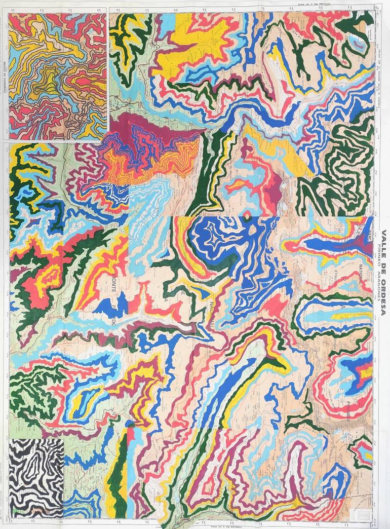In this piece, acrylic ink on a paper map crafts an abstract landscape brimming with vibrant energy. Each area of colour is decided in part by the artist and in part by the contous of the map, making each piece unique in colour and form, converging into a dynamic tapestry. Immerse yourself in its co...