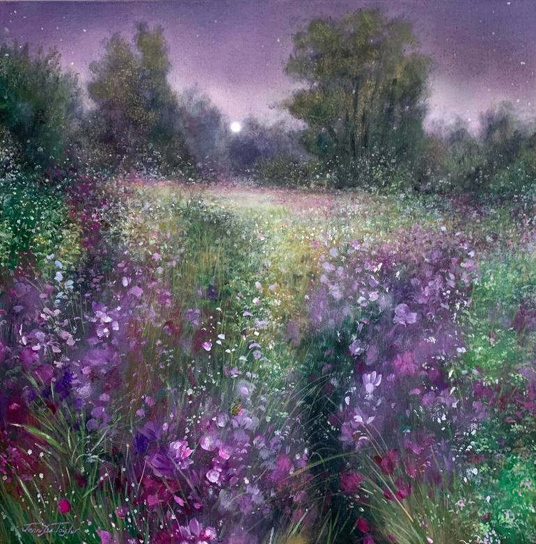 Entitled: Moon Blossom Symphony - Beautiful Original Oil Painting On Linen The meadow is alive with a symphony of flowers and blossoms, as far as the eye can see. An unfolding dream awaits us, a beautiful quiet place to let the heart and mind unwind. Beautiful Emerald and Magenta Pinks sing togethe...