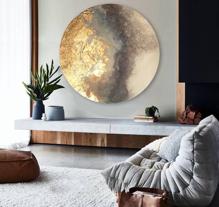 Paintings on round canvases inspired by celestial objects: the moon, sun, planets, stars, galaxies and everything else found in the sky above! As a girl and camping outside, she was fascinated by the night-time sky, gazing up at the stars and dreaming about other solar systems. This fascination gr...