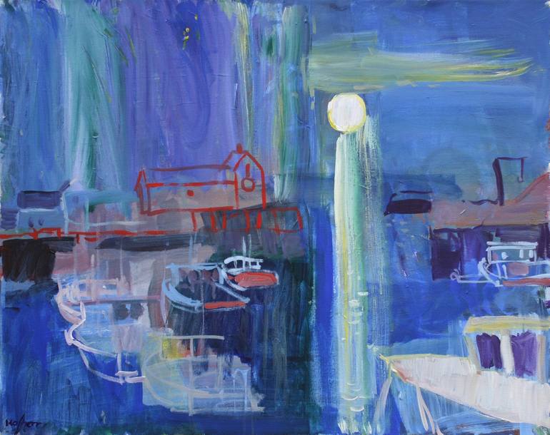 Boats in a quiet New England harbor are the subject of this expressive effort. Realistic detail here is limited, and the artistic goal is to suggest a feeling about a time of day, rather than illustrating anything explicitly. The wide washes of textured color are contrasted with the minimalist treat...
