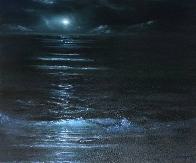 Original Canvas seascape Oil Painting Seaside Painting, Moon Seeker, 2021 Dimensions: 20x23x0.77 inch approx ( 50x60x1.9cm) This artwork is inspired by fascinating simmering moonlight over the sea, by the bold beauty of the ocean, by power and flexibility, charming versality and translucency o...