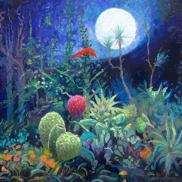 With a palette knife, Iris scooped swaths of oil paint from her palette onto the canvas. Using her fingertips, she meticulously pushed and pulled the details of the moonscape into place. Entitled "Moonbloom," the painting presents a surreal night landscape illuminated by a bright full moon. Inspired...