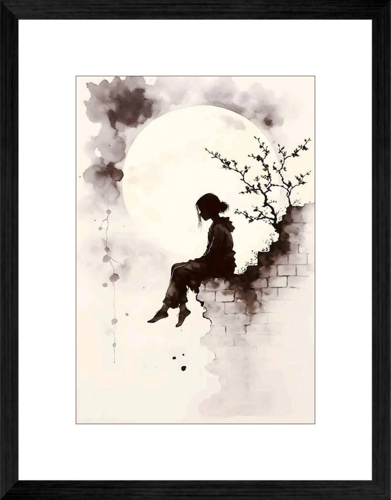 A soul-stirring watercolor-style artwork capturing a quiet moment beneath a luminous full moon. Features a young girl sitting on a crumbling wall, evoking themes of nostalgia, solitude, and quiet reflection. The monochrome palette enhances the dreamlike and emotional depth of the scene. Soft ink ...