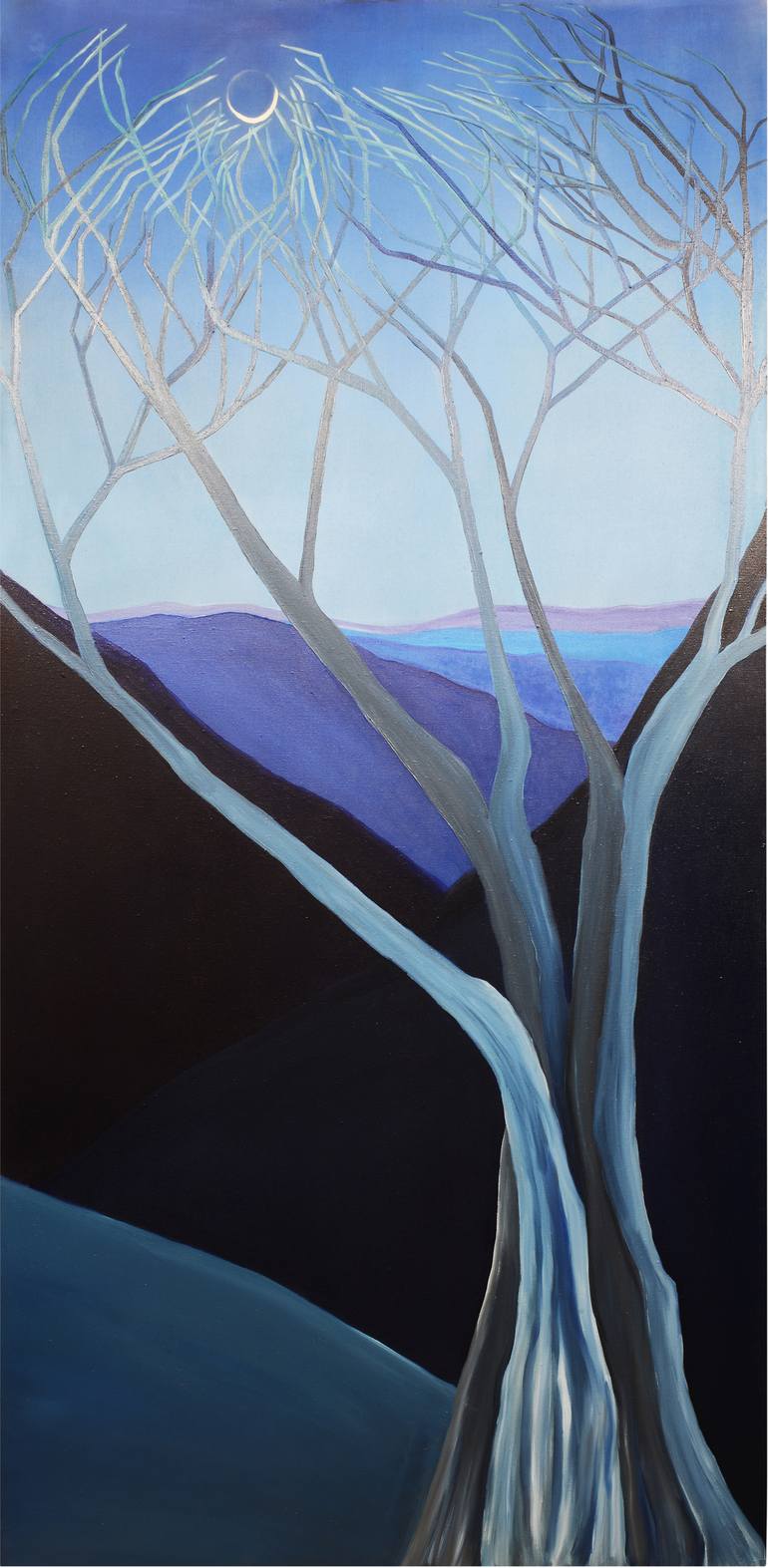 An olive tree on the hillside with marvellous mountain silhouettes. It has tried to grow towards the light. But this light is not the light she needs to grow...
