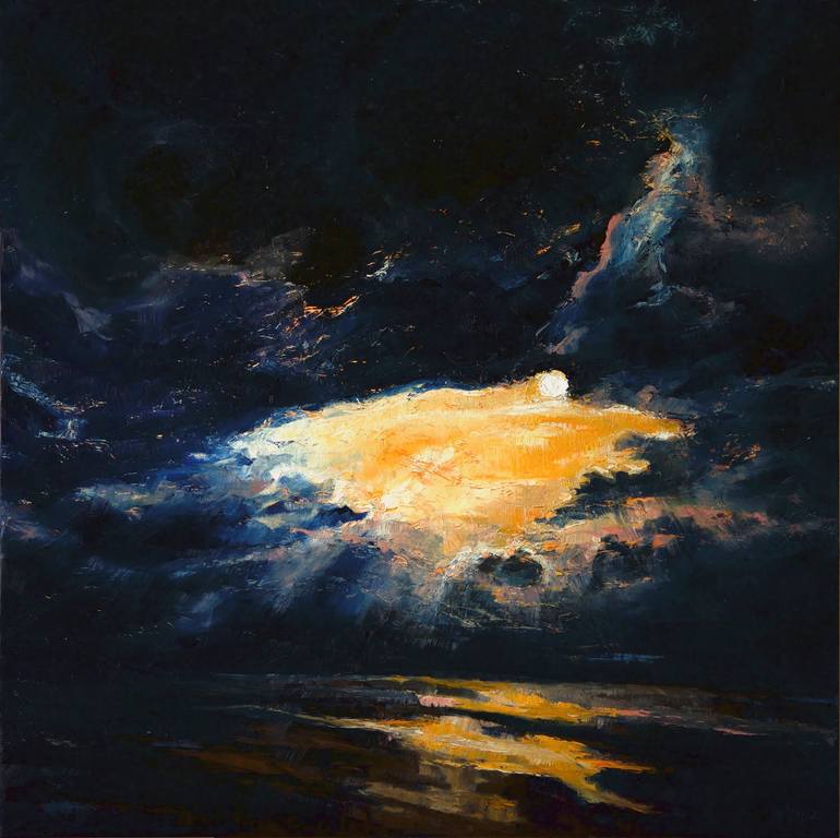 This painting is inspired by the romantic night looking at a lake and the reflection of the moon on the calm water.