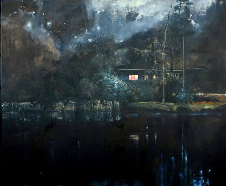 I watched a place and what happend with it by day and by night. At first it looks like a postcard view and I took my time to look deeper. The changing light gave ma the chance to capture my painting more and more into this dreamlike scene.