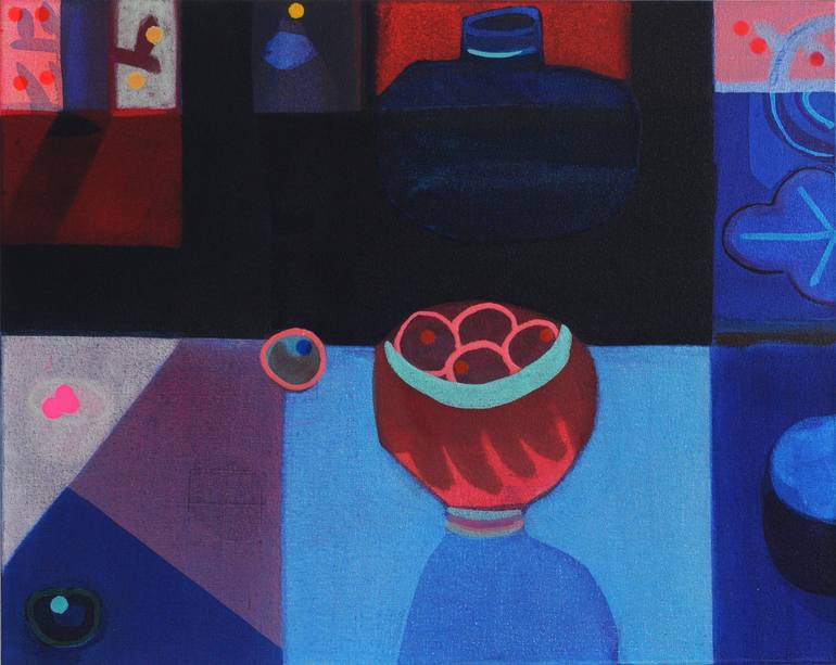 Part real, part imagined, this semi-abstract still life suggests a moonlit scene with blue light spilling over the table and fruit bowl. This painting uses acrylic and metallic inks, so parts of the canvas shimmer.