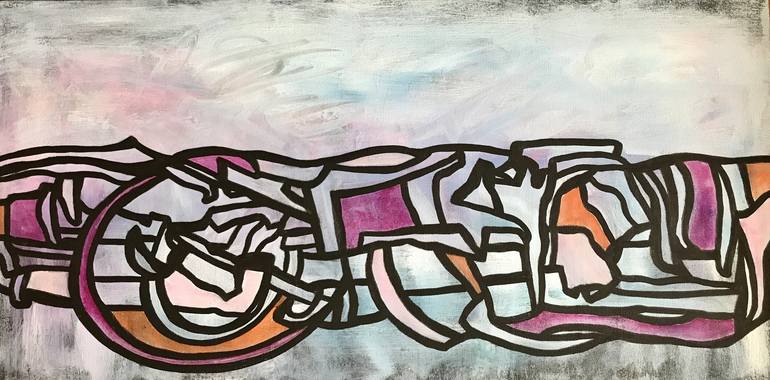 motorcycle ride on the moon This painting is a mixed media piece. It has a slight shimmer. It is signed on the back and the edges are black.