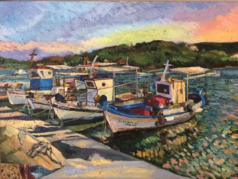 "Moored Fishing Boats, [at the Little Crab]," Baltisa, Porto Heli, 50 x 70 cm, 2017 Over the summer I worked close to the fishermen at the bay of Baltisa in order to capture the late-afternoon light on their boats.