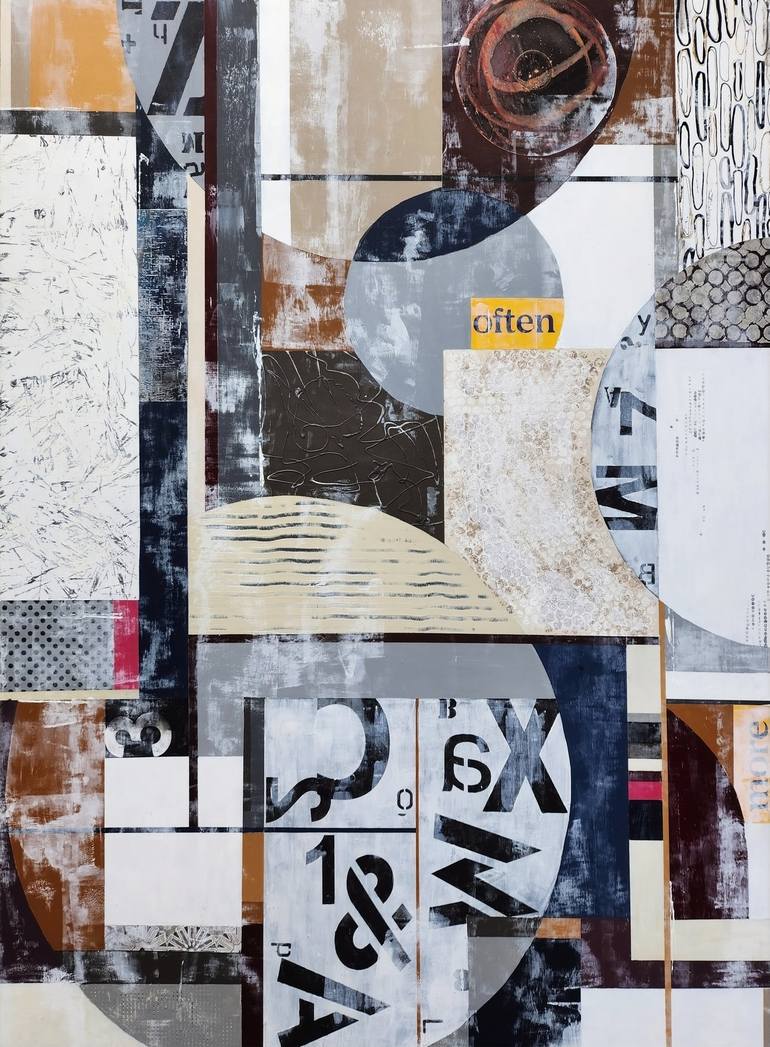 Geometric intersecting shapes are created with acrylic paint, stencils, and paper collage. Oil and cold wax is layered over for a more muted result.