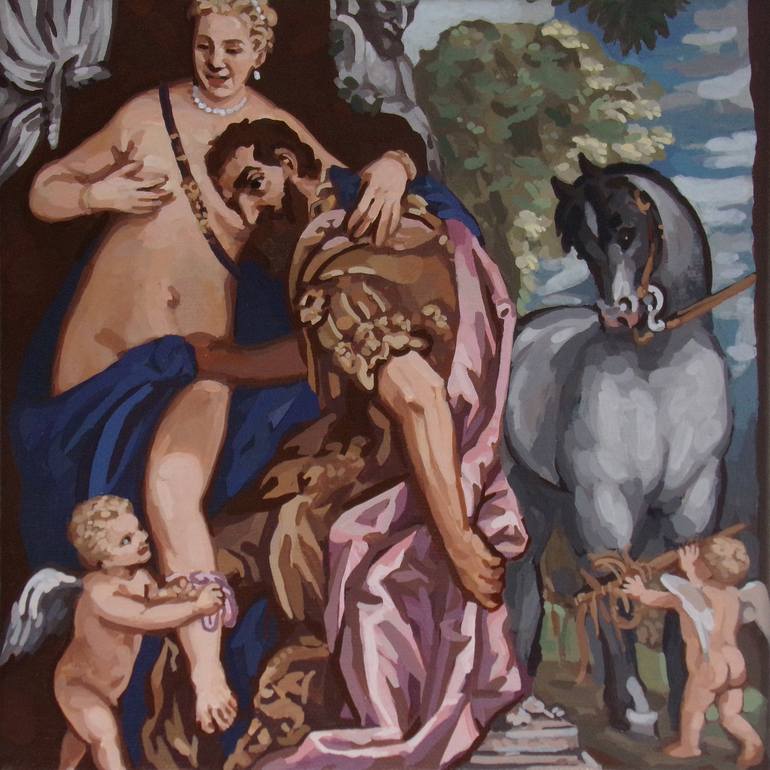 After the painting "Mars and Venus United by Love", by Paolo Veronese (Paolo Caliari), my favorite painter (The Met, New York). In the "More or less" series (D'A(peu)PRES), I make some biased copies of paintings I admire, focusing on brushstrokes and colored spots. As in some kind of "Pop Impressi...