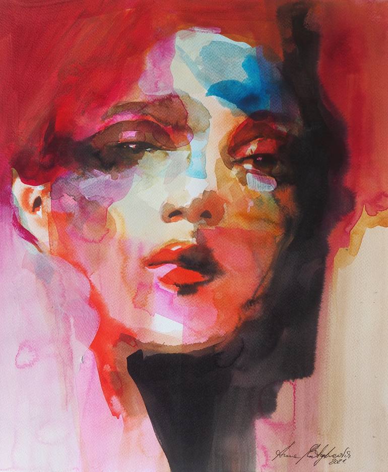 Emotional portrait inspired by human nature, expressive, mixed media on paper.