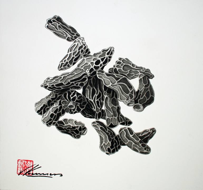 Sumi ink brush painting of harvested Morel Mushrooms.