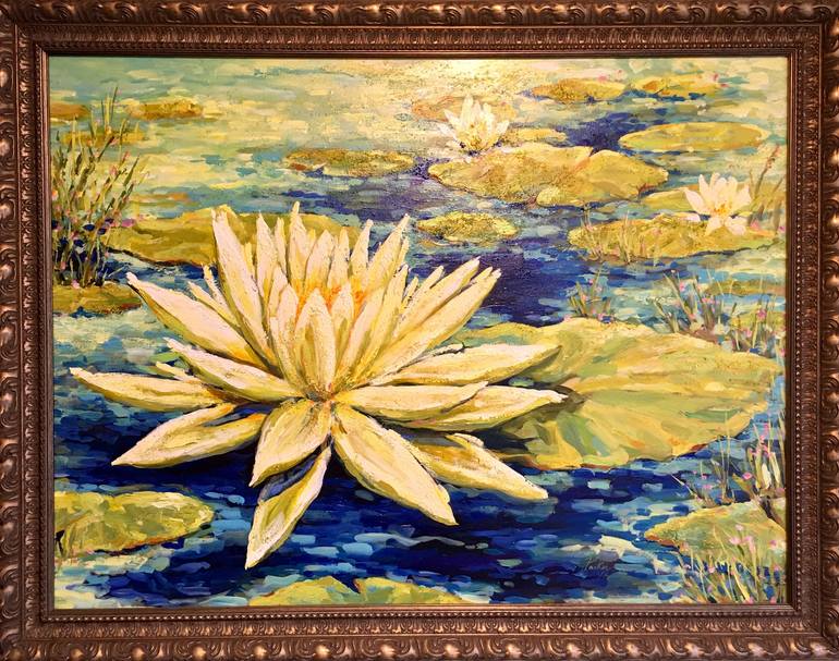 Large pale yellow and white Waterlily floating in an Impressionistic morning sunlit pond. blue hues, bright greens, yellow highlights. Heavy paint with sand textures creating a Monet impressionistic style. Young flowering waterlilies surround the large Waterlily with water grasses.