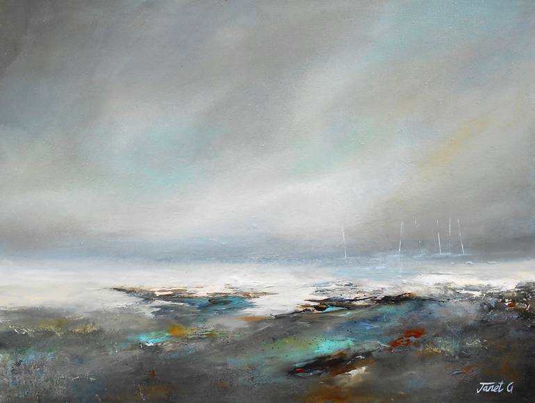 A medium size semi abstract coastal seascape painting. Dark and light shades collide creating a moody, atmospheric work of art. It has a rustic modern feel with the use of many painterly qualities throughout. The subtle shades of a cloudy stormy sky reflect onto the land of sand rock and stone usi...