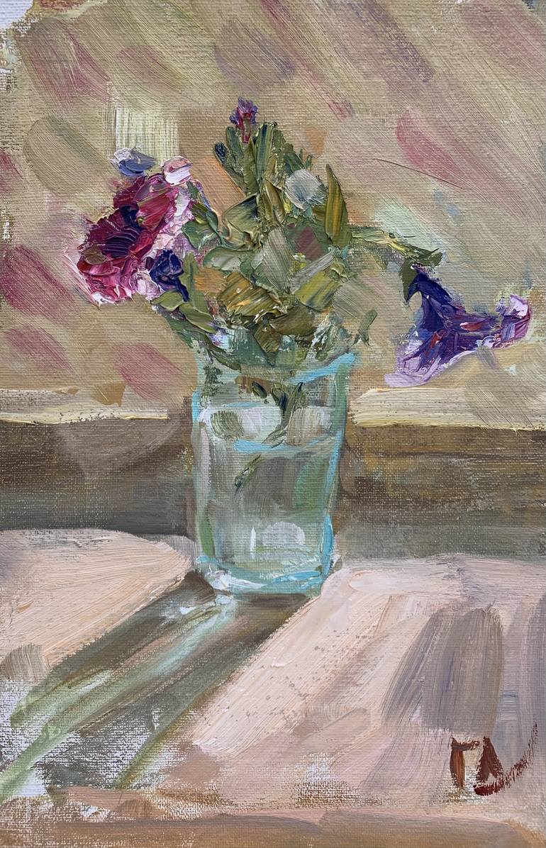 I wanted to catch the moment of living nature. The flower was torn off by the wind, it got a new life in glass and I had the opportunity to capture it. It is totally unique artwork. One of a kind. The size isn't big, but it contains a lot of bright energy. The painting is framed and ready to be ha...
