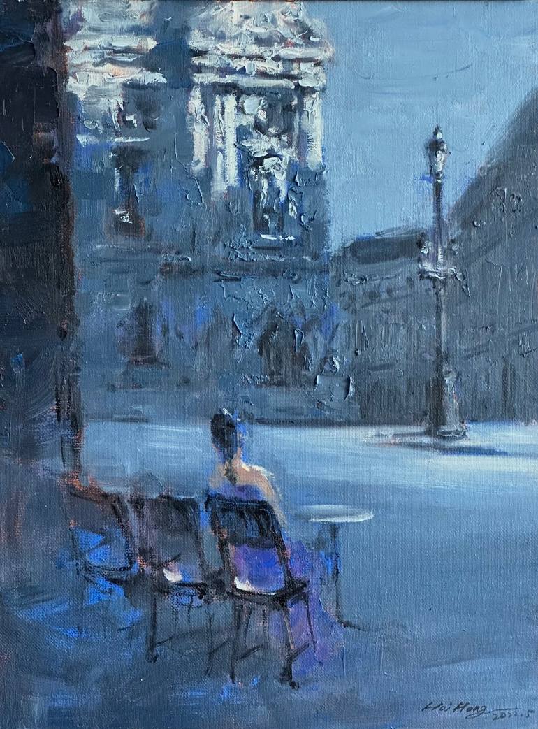 Morning (Paris) is a poetic exploration of a tranquil moment in the city of light. Inspired by the serene beauty of Paris in the early hours of the day, this painting captures the soft glow of morning light as it bathes the historic architecture. A solitary young woman sits with her back to the view...