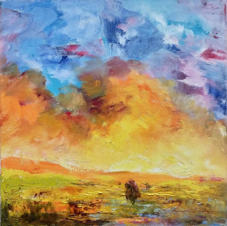 This painting captures the rain-washed beauty of a vast landscape in the earliest hours of the morning. The expanse of a turbulent sky in a kaleidoscope of colours competing to gain dominance, while below, the land awakes to a fresh day, adorned in all the loveliness of the soft morning light exposi...