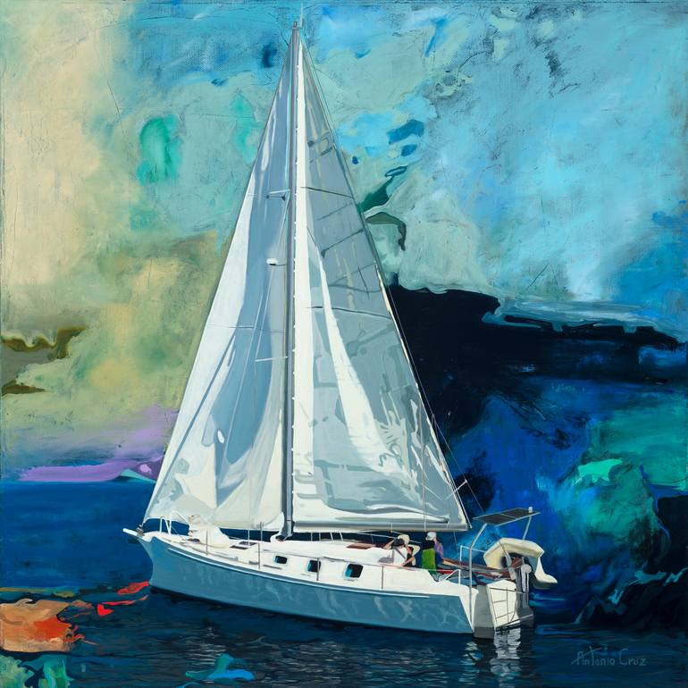 A lone sailboat embarks on its journey across an endless expanse of ocean. The white sails, bathed in the soft glow of dawn, billow with the promise of the unknown, each ripple in the canvas a whisper of the sea's infinite depth. The boat, a solitary figure against the vast horizon, seems both fragi...