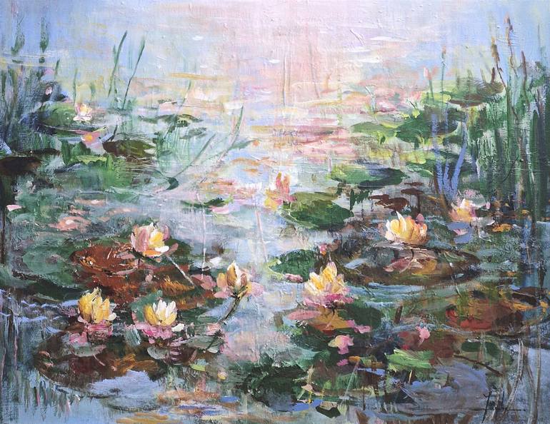 The water lily pond painting, 80x60cm. The sides of the picture are painted, the varnish contains UV protection.