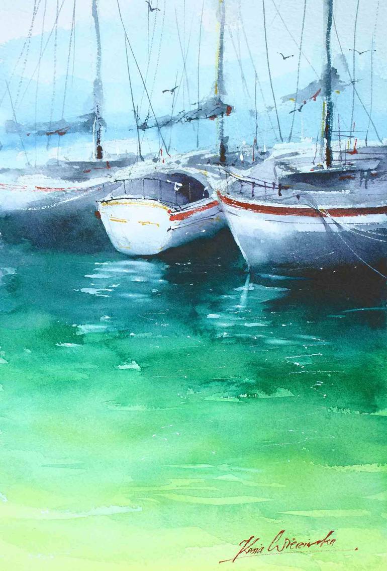 In this serene watercolour painting, we can see the tranquility of a peaceful morning at the marina. The soft hues of the sky blend seamlessly with the calm waters, creating a soothing atmosphere. Three boats gracefully rest upon the gentle ripples, the light reflecting upon the surface. The delicat...
