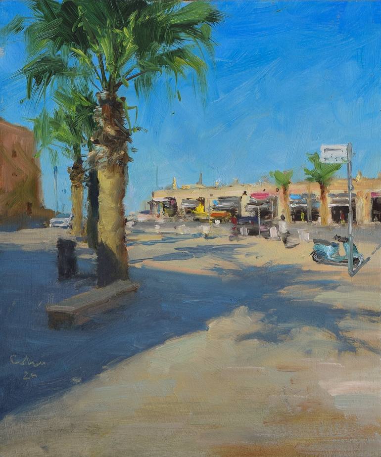 The plein air painting captures a sunny scene of palm trees casting long shadows on a street. The bright blue sky contrasts with the warm colors of the buildings and the brown trunks of the palm trees. A bench sits in the shade of the trees, and a small scooter adds a touch of whimsy to the scene. T...
