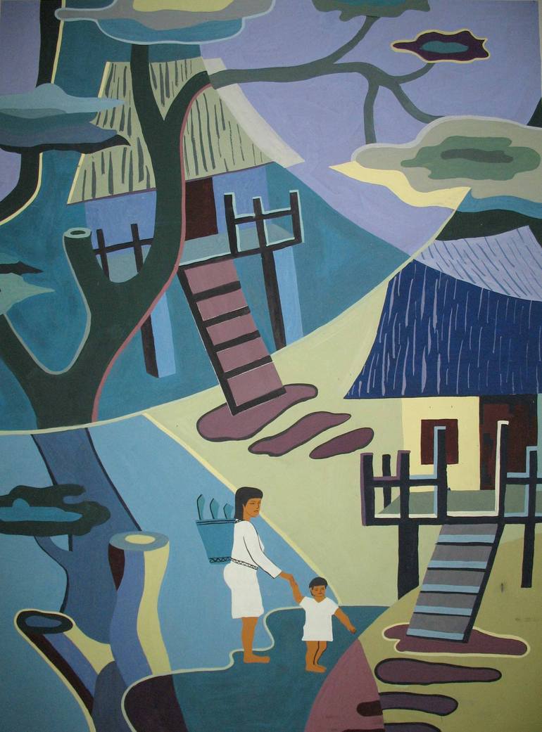 morning on the plateau morning on the plateau is a poetic painting, depicting the simple beauty of the life of the people of the Central Highlands. In the center of the painting, the image of a mother and child doing housework together, creates a warm, intimate scene. The golden morning sunlight dye...