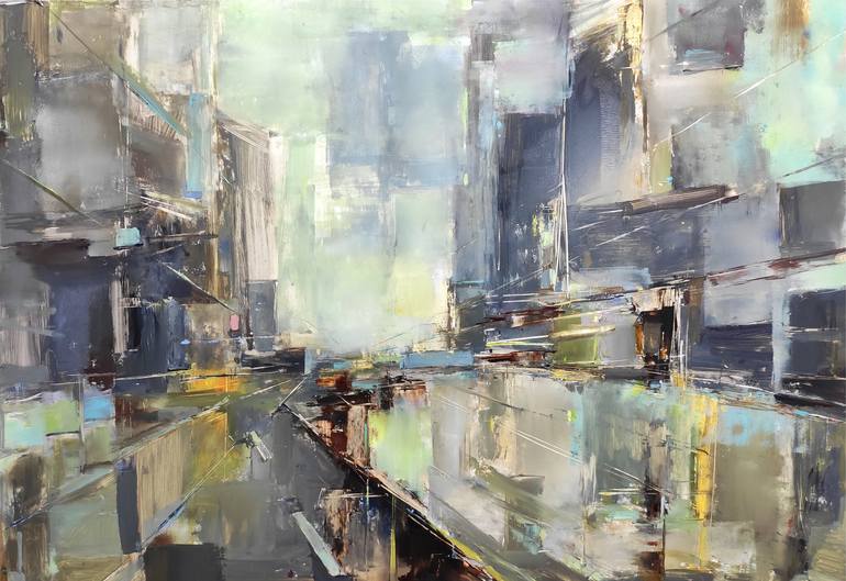 Urban landscape. The city wakes up in the morning fog, with its colors, with its sounds, rhythms. I wanted to convey this atmosphere in my painting. Private collection.