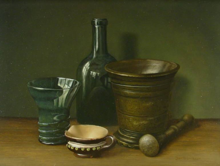 Jan Teunissen, born in 1949, grew up in Zeelst, in the south of The Netherlands near by Eindhoven. He lives and works in Best, also located in North Brabant. Initially, he followed a technical education and graduated as a business engineer. Until 2002, he did this alongside a job in business, after which he focused on painting. Jan Teunissen is a major autodidact and his work is characterized by a high level of reality and often somewhat mystical, clair-obscurious atmosphere. Still life with images of utensils and food such as bread and fruit. So lifelike, and basically no bigger than in real life, these paintings are such that they evoke comments and have ratings such as: "So real you would take a bite out of it.", "You can smell what fruit it's all about." or "Any moment a worm can crawl out of those pears." Studying many pieces of art from the old masters and experimenting with materials and subjects, gave Jan the ability to make realistic paintings in a responsible and artistic way. The paintings of Jan Teunissen, beside at the Netherlands, have been exhibited and sold in countries such as Belgium, France, Hong Kong, India, Italy, New Zealand, Oman, Taiwan and Qatar.