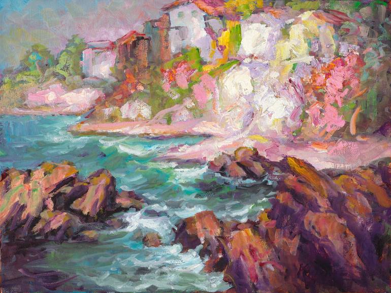 Artist, Manfred H. Kuhnert captures the afternoon sun in his depiction of Moss Point, Laguna Beach, California.