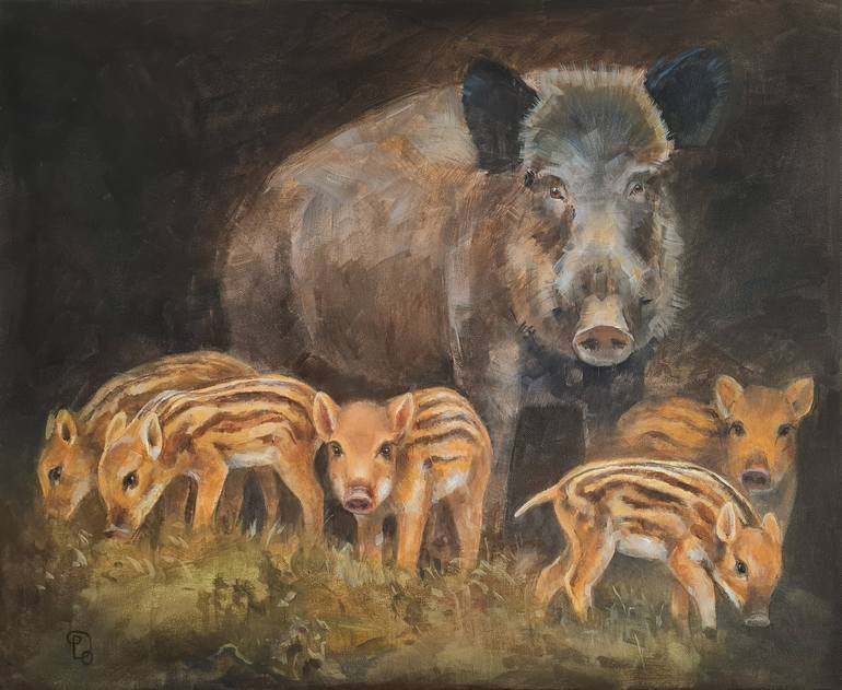 The oil painting beautifully captures the essence of a wild boar family in their natural habitat. The centerpiece of the artwork is a large, attentive mother boar, standing protectively over her five adorable yellow-striped piglets. The mother, with her watchful eyes and strong presence, symbolizes ...