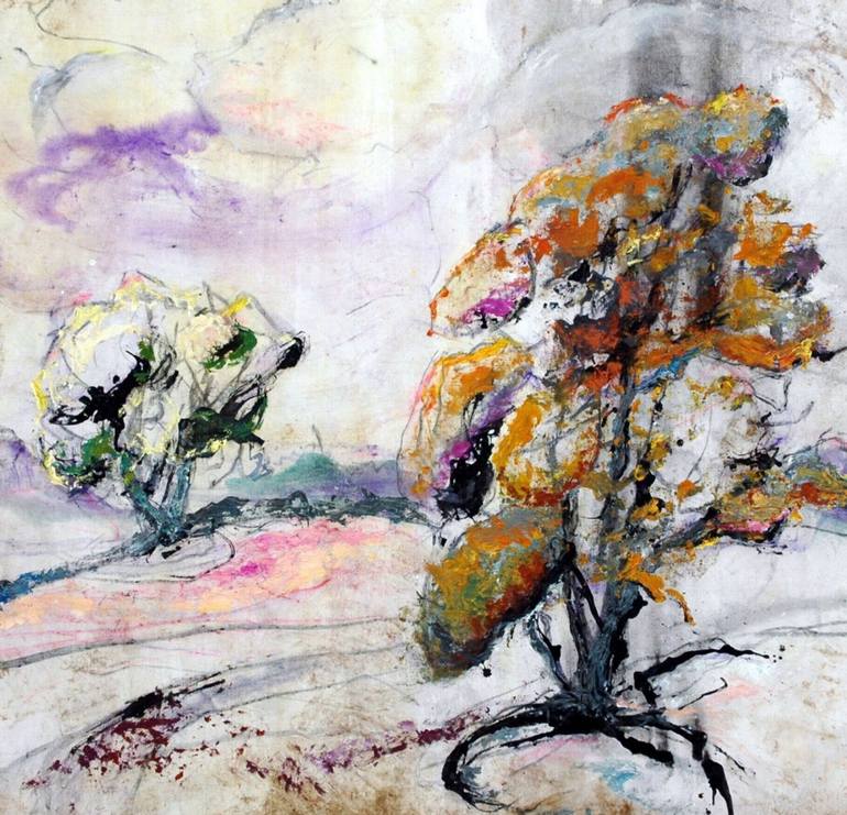 Painting of two trees as a metaphor for a mother and child relationship. Painted en plein air in Balboa Park, San Diego, CA. Framed in beautiful contemporary oak floater box frame, ready to hang.