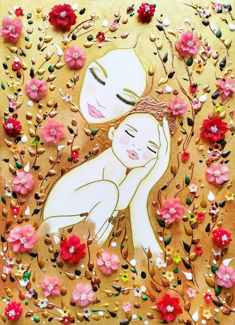 Mother and baby - beautiful original fine art portrait painting on canvas. Floral textured artwork with Mother earth and abstract flowers. Love gift for women and mom. Stunning decorative home decor with Mom and child / Mother and daughter or mother and son. Romantic art for nursery decor, living r...