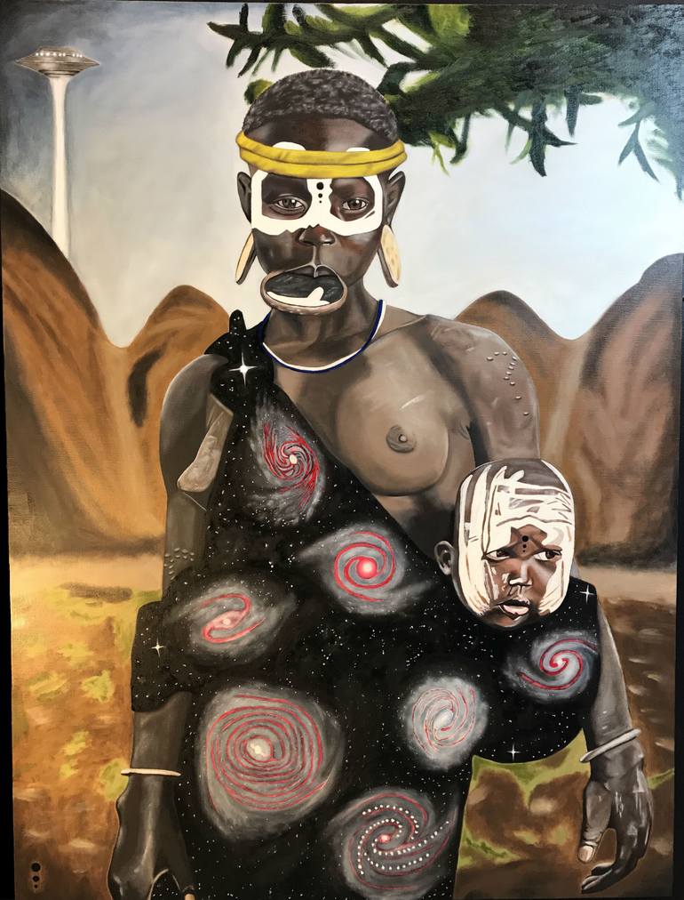 Oil on Linen Enlightened mother and child from the Omo Valley of Ethiopia. The Omo Valley is one of the origins in which body modification and scarification are used as a way of beautification and elevated status amongst women.