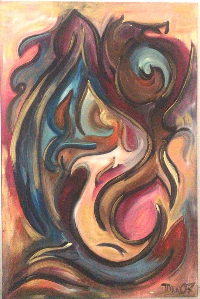 This painting entitled “Motherly” is an abstract painting depicting a mother and the complexity of the relationship with her children, conveying harmony, love, but also pain.