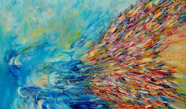 Abstract expressive painting by the highly accomplished British painter Victoria Horkan. Turquoise colors, multi-colors, and textural aspects make this painting a real show-stopping painting. Her work exudes energy, movement, and joy. Uplifting statement piece.