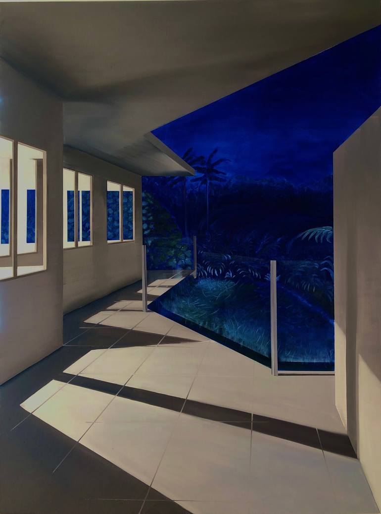 From age 4 to 8 I lived in Lima Peru. My Steph father developed schools in 'los Pueblos Jovenes'. In the Netherlands I studied Communications and Design. At this time (1991) I became the singer of the most popular Student band in The Netherlands, The Hermes House Band. Our songs ' I will survive' and 'Country roads' became, among 10 other songs, a worldwide succes. In 2023 we even reached 100.000.000 streams on Spotify. I married my high school sweetheart and we raised 3 beautiful kids. In 2013 I decided to become a professional painter and so I did. I graduated at the Wackers Academie of Art in Amsterdam. My teachers are my biggest inspirators. Jim Harris, Sam Drukker, Robbert Vorstman, Rogier Willems, Maarten Welbergen, Tatyana Yassievich, Irma Braat. For graduation my work was judged by Koen Vermeule (among others) and also he is an artist I admire. Carlos Sagrera and Gustav Undin are my current inspirators. I also admire Arnout Killian, but it all started with my love for the work of Edward Hopper. In 2021 we decided to move to Bali. This is where I live and work at the moment. In my work I focus on daily scenes and subjects. The shadow of the tree on the tiles; the sunlight in the room; the view from one room through the other; the reflections on the floor; and the rhythm of lines in the stairwell. Figurative, but with a twist. Not just a nice picture, but everyday subjects with a melancholy touch. It's about time and stillness. It's about our transient live. Melancholic and beautiful. With a main focus on light and dark, strong lines and reflections. If you look at my work, you wouldn't tell that I'm actually a chaotic dreamer who could loose herself in time and space. As a child I did. Along the way I created structure in my daily life. I learnt to organize my living space. I never used an agenda so all that mathers is in my head, on small papers and in my sketchbook. Moving to Bali created a new kind of chaos. The sound of bikes and birds, the overwhelming colors, the organic forms of the jungle and chaotic architecture took me completely out of my comfort zone. It took almost a year to reorganize and discover structure and stillness in my new living space. Bali's ongoing rituals and spirituality are my new inspirators. I got caught by Bali's morning and night sights. Bali's magical sunrises and downers. I started to paint my daily view from the villa that we rented.
