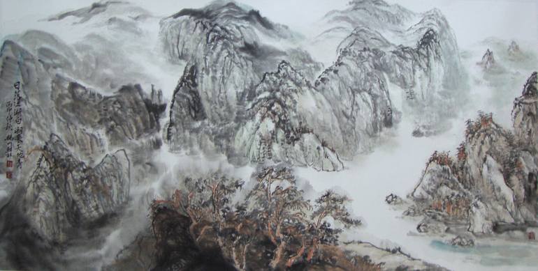 This painting presents a mountain view at sunset in the spring. The river tide is going out, mist hovers in all the valleys.