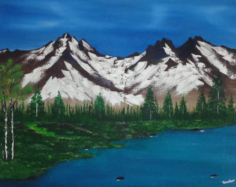 A view in himalayas , during evening near lake . Massive mountain is fully covered by snow and down the mountian , lake is full of water . Wet on wet technique used for the painting , using Bob ross knife technique for mountains. Ideal to be placed in Living room and bedroom.