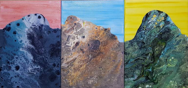 I wanted to create a three panelled work with the three primary colours as background, and use the acrylic pour technique to create three different mountainous foregrounds that sat happily together. Each panel is unattached and can therefore be displayed in any order. Each one is double coated with ...