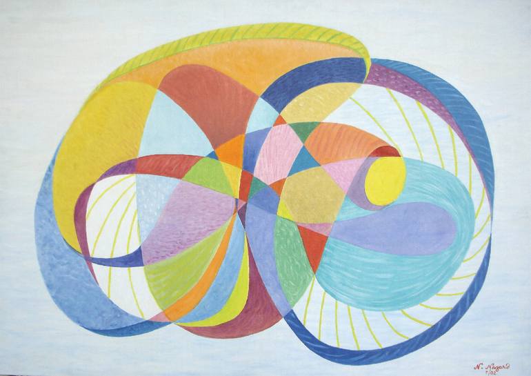 In this work I wanted to express several forms from the crossing of a single curve and continuous line on almost the entire surface. Then, by filling these forms with bright colors in oil, I was able to visualize the total set and can be interpreted as a kind of movable apparatus.