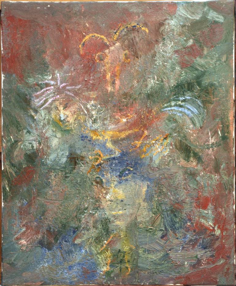 One of a series of "apparitions" created by finding stories in randomly applied paint, by the process of pareidolia. Some of these take months of staring at the canvas and turning it round, before the figures hidden in the painted surface come to life. Then you still might not know what they mean. ...