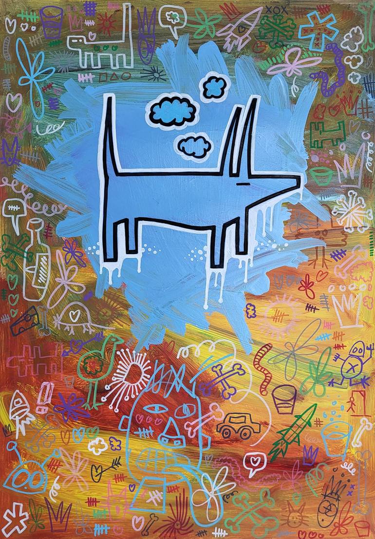 Mr Blue Acrylic paint, Marker. Paper: Rosaspina de Fabriano, 50 x 70cm 285g/m² Signed, stencilled and dated on the reverse.